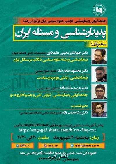 به گزارش عطر حرم به نقل از مهر، به همت جامعه ایرانی پدیدارشناسی انجمن علوم سیاسی ایران، نشست پدیدارشناسی و مساله ایران، پنج شنبه ۲۰ شهریورماه برگزار می گردد. این نشست با سخنرانی جهانگیر معینی علمداری عضو هیأت علمی دانشگاه تهران درباره پدیدارشناسی و رشته علوم سیاسی با تاکید بر مسائل ایران و محمود مقدم شاد دکترای علوم سیاسی درباره پدیدارشناسی، زندگی روزمره و سیاست و حمید ملک زاده دکترای علوم سیاسی درباره جامعه ایرانی پدیدارشناسی: گزارش کلی و چشم انداز رو به رو همراه خواهد بود. مدیر این نشست که پنج شنبه ۲۰ شهریورماه از ساعت ۲۰ الی ۲۱: ۳۰ برپا می شود، رضا نجف زاده عضو هیأت علمی دانشگاه شهید بهشتی است. پخش آنلاین نشست علمی در بستر سرور مجازی (bigbluebutton) به آدرس https: //engage۲.shatel.com/b/vze-۳hq-xxc هم صورت می گیرد. حضور در این جلسه علمی برای عموم علاقمندان آزاد و مجانی است. علاقه مندان برای کسب اطلاعات بیشتر می توانند با شماره ۰۹۳۳۷۳۵۷۵۷۶ تماس بگیرند.